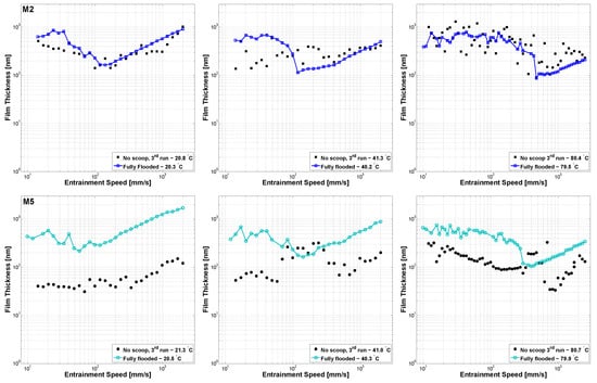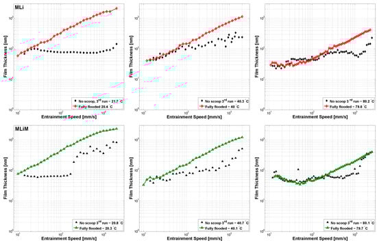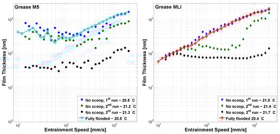 Generally, under fully flooded conditions, the film thickness under low entrainment speeds shows a “plateau-like” region where the film thickness is almost independent from the entrainment speed, decreasing very slightly with it. This behaviour is attributed to the thickener material crossing the contact, and the scatter can be considerably high in this region. Upon reaching a certain minimum value, the film thickness starts to increase at a slope of U, typical of oil lubrication [,,,,]. Not all greases show this behaviour under the same temperature or speed range. According to Figure 3, the differences between the first and third speed ramps are very clear, showing that the longer the test duration is, the higher is the deviation from the fully flooded result is. This deviation is attributed to starvation: the lack of scoop causes the contact to gradually starve as the time of the test increases, associated, of course, with the increasing speed (and centrifugal forces) which pushes the grease away from the contact. It is also evident that the lack of scoop greatly increases the scatter of the results, not only in the low speed region, but also in the high speed region. It was also common to measure film thickness values above the fully flooded result for certain speeds. The grease’s chaotic and random behaviour [] made it hard to measure a representative film thickness for a certain operating condition. It was also difficult to obtain repeatable curves, without the scoop to “control” the replenishment. In the case of the polymer greases, it was even harder, probably due to the increased thickener size [].