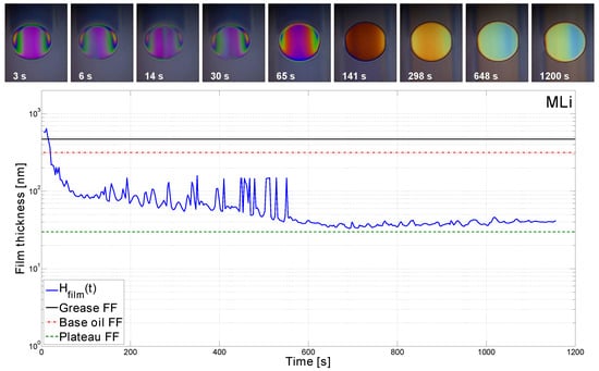 The central film thickness of grease MLi, measured over time in the ball-on-disc contact at a temperature of 40 C, 5% of SRR and under an entrainment speed of 0.5 m/s is shown in Figure 5.