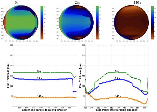 By analysing the film thickness pictures, it is also possible to see that, generally, in the first 100 s of operation, the film thickness profile resembled a “horse-shoe” which is typical of a fully flooded contact. As the time increased, this profile continuously changed until starvation was reached. As an example, Figure 6 shows the top view of the film thickness profile of grease MLi under the operating conditions of Test 3 (see Table 3), after 5, 29, and 140 s of test time. In the same figure, cross-section film thickness curves were shown, taken over a central line parallel to the rolling direction and over a line transverse to the rolling direction. From these curves, it is possible to observe the evolution of the central and minimum film thicknesses during the test. As the time increases and the contact gets further starved, a ratio of and starved conditions are reached.