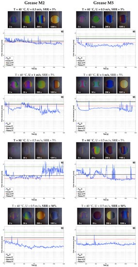 It can be generally observed that the initial film thickness values were similar, but frequently higher than the fully flooded film thickness of each grease under the same operating conditions. In the case of the polymer greases, it was common to find even higher values, closer to the film thickness plateau under low speeds. At just a few seconds into the test, the film thickness of all greases dropped quickly. After some time, the film thickness decay rate slowed considerably, reaching the stabilization stage, as expected from the literature [].