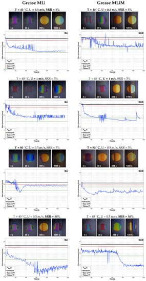 The fact that MLiM shows the highest COF should be due to a combination of a high viscosity mineral base oil and a lithium complex thickener. The mineral-based oils generally produce higher COF values [], and the high viscosity should promote higher viscous friction and quicker starvation (starvation phenomenon happening with less operation time and at lower speeds).
