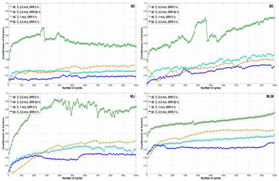 Coefficient of Friction (COF) curves of the M2, M5, MLi and MLiM greases, measured over time under different operating conditions.