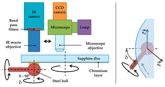 The ball and its drive can be inclined around a contact normal in the range from 0° to 90°. The angle is referred to as δ angle, as indicated in Figure 1. This inclination results in different direction of the ball and the disc velocities. By reversing the direction of rotation of the ball, the angle between surface velocities of 90° to 180° can be achieved.