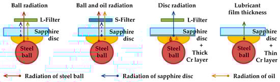The scheme of the measurement procedure is depicted in Figure 3. Radiation of the contact is composed of radiation of the steel ball, the disc and the lubricant. Two band filters referred to as L and S filter and disc with and without a chromium layer were used to separate individual components of radiation. The L filter transmits the radiation of the steel ball only while the S filter transmits the radiation of both the ball surface and the lubricant volume. In both cases, a sapphire disc without coating is used. When the L filter is used with the sapphire disc having a thick chromium layer on a contact side, only a radiation of disc surface is dominant.