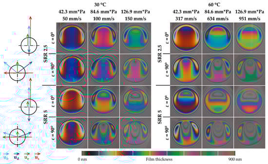 Recently, Omasta et al. [,] studied lubricant film thickness distribution under the conditions, where the rolling and the sliding velocity has different direction. They found that the direction significantly influences film shape once the sliding speed and related thermal effects are large enough. An asymmetry of the film shape under high sliding conditions was found although the kinematic conditions were symmetrical. Those conditions are interesting, especially when sliding is perpendicular to the rolling. This situation could allow to distinguish the effect of sliding and rolling speed and to provide better evidence of the mechanism responsible for the film shape changes connected with the sliding. Nevertheless, temperature mapping under the conditions has not been made yet.