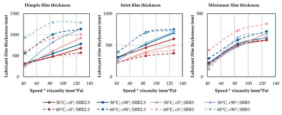 The effect of sliding direction is very interesting. For low speed with SRR 2.5 and 30 °C the effect is negligible, and this state could be termed as isothermal. As the speed or temperature increases, lateral sliding leads to thicker film compared to longitudinal sliding. At 60 °C and SRR 2.5 inlet film thickness is almost double for lateral sliding. There is also a significant increase in minimum film thickness. For SRR 5 the effect is similar in the case of central film thickness. On the other hand, minimum film thickness may decrease for lateral sliding as the dimple becomes narrow in the entrainment direction. This is evident at SRR 5 for low speed and 60 °C, where the minimum film thickness under lateral sliding is roughly one-quarter of the thickness for longitudinal sliding.