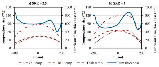 The graphs showing the effect of SRR on lubricant film thickness and temperatures in longitudinal profiles at y = 0 (t = 30 °C; ε = 0°; high speed, ue = 150 mm/s; pH = 1.2 GPa): (a) SRR = 2.5; (b) SRR = 5.