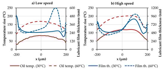 The effect of ambient temperature and the speed normalized with respect to changed viscosity is shown in Figure 7, where oil temperature and lubricant film thickness profiles are compared. It is evident that the increase in ambient temperature increases oil temperature rise, while the shape of temperature profile seems to be similar. Despite, there is a significant change in lubricant film shape at low speed. The dimple occurring at 60 °C is not reflected in the corresponding oil temperature profile. At high speed, the dimple occurs in both the cases and shape of the oil temperature profile is similar, i.e., inclined in the entrainment direction.