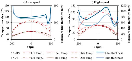 The graphs showing the effect of normalized entrainment speed on lubricant film thickness and temperatures in longitudinal profiles at y = 0 (t = 30 °C; ε = 90°; SRR = 5; pH = 1.2 GPa): (a) Low speed (ue × η0 = 42.3 mm·Pa); (b) High speed (ue × η0 = 126.9 mm·Pa). The profiles in light colors represent corresponding results for ε = 0°.