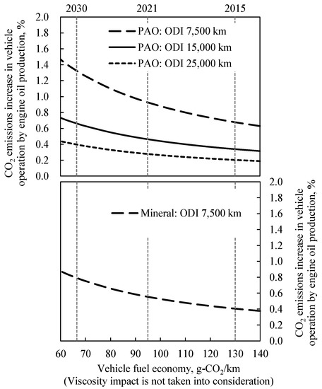 Figure 5 illustrates the CO2 emissions during the production of ULV-Mineral and ULV-PAO with the formulations shown in Table 1. CO2 emissions from the production of mineral engine oils were estimated at 0.99 kg-CO2/L. Meanwhile, the CO2 emissions from synthetic engine oils production were estimated to be 1.65 kg-CO2/L, which is 1.7 times higher than that of the mineral engine oils. The contribution of CO2 emissions from engine oil production in relation to CO2 emissions generated during vehicle operation will be described. As the vehicle fuel efficiency improves, the ratio of CO2 emissions from engine oil production to CO2 emissions generated during vehicle operation increased, as shown in Figure 6. Concerning the mineral engine oils, when the ODI was set to 7500 km, the CO2 emissions during vehicle operation using 2030 standards (vehicle fuel efficiency is estimated to be 66.5 g-CO2/km) increased to 0.8% and it was associated with the production of mineral engine oils. Meanwhile, when synthetic engine oil was used, CO2 emissions in vehicle operation significantly increased to 1.3% under the same conditions. By extending the ODI from 7500 to 15,000 and 25,000 km, the impact of CO2 emissions from synthetic engine oil production on CO2 emissions during the vehicle operation were effectively reduced to 0.7 and 0.4%, respectively. In other words, from the viewpoint of reducing CO2 emission, the extension of the ODI is technologically challenging but as important as the reduction of viscosity is.