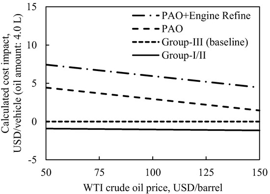 It is important to consider the base-stock prices survey results for Group-I/II, III, and PAO base-stocks. As shown in Figure 8, the mineral base-stock prices and the West Texas Intermediate (WTI) crude oil price [49] were approximately linearly correlated. However, there was no clear link between the PAO base-stock price and the crude oil price. This has to do with the gap between production capacity and market demand of PAOs. The global PAO market size is expected to slightly increase to $4210 million by 2025 from $3840 million (USD) in 2017 [50], and therefore the PAO base-stock price is likely to be stable up to 2025. Figure 9 shows the calculated cost impacts of the three different oils taking in to account the WTI crude oil price (Group-III is the baseline price).