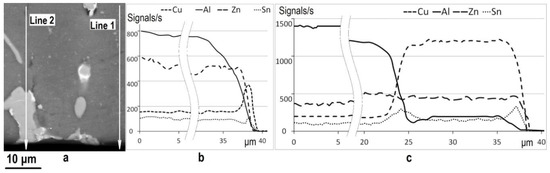 To determine the relative changes in the elements of the bearing material versus the depth of penetration, an energy-dispersive analysis was performed (Figure 4). The curve distribution character changes depending on the local area being analyzed (Figure 4b,c). In the area without inclusions, aluminum, the main component of the matrix, gradually wears out during the friction process (Figure 3b). The aluminum-depleted layer is about 5–7 micrometers thick. The same character of the distribution curves has the majority of alloying components, for example, zinc (Figure 4b). However, it is obvious that the surface content is higher relative to the matrix in which it is predominantly dissolved than it was in the initial state. The content of copper in the subsurface layer increases sharply. This is probably due to the difference in the wear rate of the softer aluminum matrix and copper inclusions: aluminum wears out at a faster rate, increasing the proportion of copper in the total composition of the subsurface layer. A small increase in content, accompanied by a small preliminary decrease, is shown by tin, and as a consequence, its satellites, calcium and potassium. If there were only an increase in the concentration of tin, it would enable it to be deposited from other sites through the “smearing” effect onto the surface. However, the presence of a depleted region on the graph allows us to infer the forced transfer (“pumping”) of this element from the subsurface layer to the friction surface.