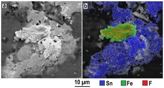 Steel-based fragment in tin outlet. (a) SEM image; (b) elements distribution map.