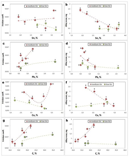 Dependence graphs of the component contents in the secondary structures on the tribological properties of alloys. (a) Tin influence on friction coefficient; (b) tin influence on alloy wear; (c) lead influence on friction coefficient; (d) lead influence on alloy wear; (e) copper influence on friction coefficient; (f) copper influence on alloy wear; (g) carbon influence on friction coefficient; (h) carbon influence on alloy wear.