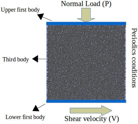 To analyze the mechanical-electrical behavior of a sheared third body layer, an elementary shear cell is used. It is composed of a set of rigid circular particles representing the third body layer and two clusters of particles to delimit the system in the direction perpendicular to the shear direction. These two walls, rough and non-deformable, represent the first upper and lower bodies. A normal force is applied to the upper wall, while a speed is given to the lower one. Periodic conditions are applied in the shear direction to represent an infinite contact (cf.