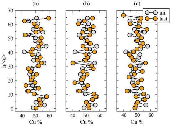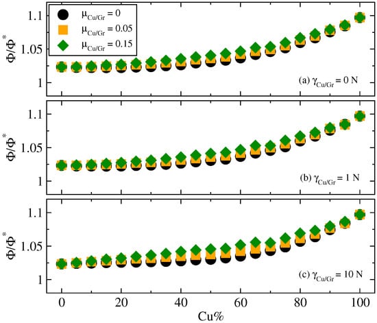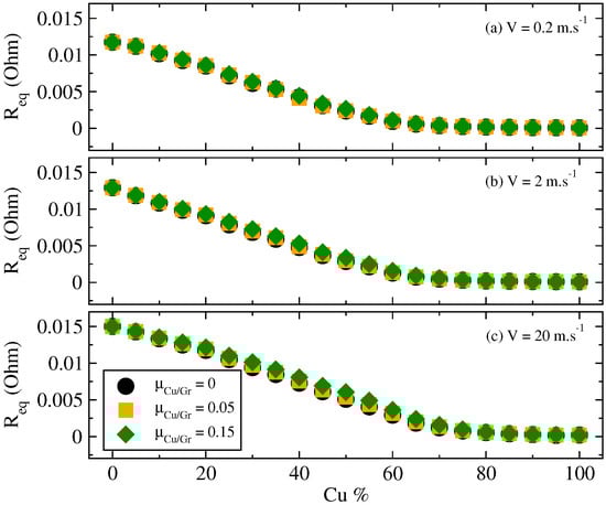 Compared to previous global measurements, local friction has a greater impact on the evolution of . When the Cu/Gr friction was equal to the Gr/Gr friction, had a linear evolution, varying from to . Then, when the Cu/Gr friction decreased, a loss of linearity was observed with a non-monotonic evolution for a zero friction value for a minimum close to of copper. This trend was not affected by the different shear rate values. Nevertheless, in the absence of local friction, the position of the minimum value of changed and tended towards a copper percentage of approximately (for a shear rate of 20 m/s). Finally, it can be noted that the increase in shear rate reduced the gap between the different curves.