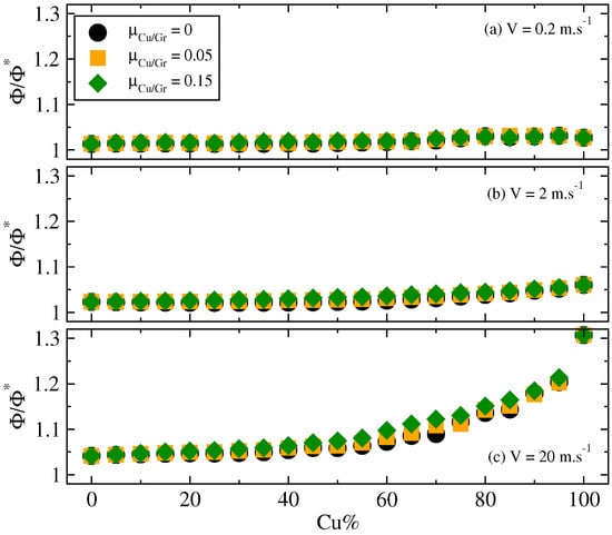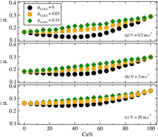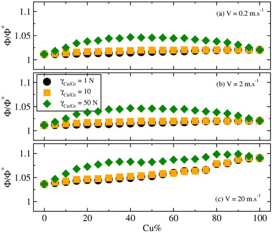 For the highest value of V (i.e., 20 m/s), the evolution was different. As in the case of dry materials, the high shear rate exacerbated the difference between local properties: an almost linear increase of was observed for Cu/Gr cohesion values equal to 1 and 10 N. For the highest cohesion value, increased rapidly with the increase in copper percentage, and then saturated due to the exacerbation of the local copper property by the high shear rate.