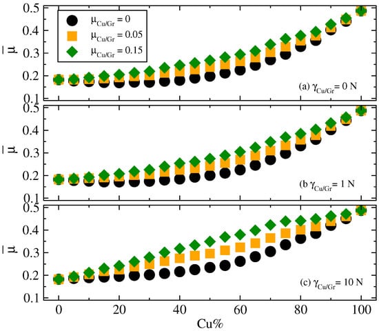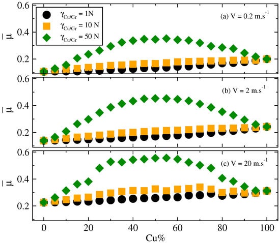 9]. Three Cu/Gr cohesion values were used: 1, 10 and 50 N. The first value corresponded to an intermediate value between the Gr/Gr and Cu/Cu cohesion values. The second value was equal to the Cu/Cu cohesion, while the last value was taken as five times greater than the Cu/Cu cohesion to be able to extrapolate the results. As in previous analyses, the same range of shear rates was tested (i.e., 0.2, 2 and 20 m/s).