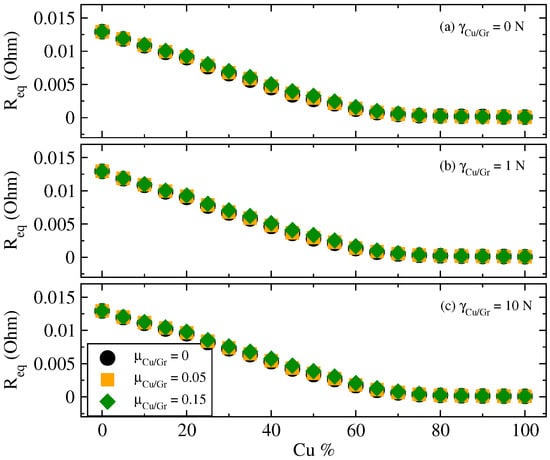 The effect of local properties was higher than for porosity or electrical resistance measurements. As with the porosity ratio, naturally increased with the increase in copper percentage. When Cu/Gr friction was high, the increase of was greater. When the Cu/Gr cohesion increased (in the ranges considered), the evolution of the overall friction was affected in particular for the highest local friction value. When cohesion was equal to 0 or 1 N, the general trend of was the same. However, for the strongest cohesion (i.e., 10 N), the curvature of changed.