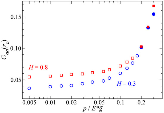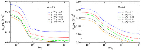 Figure 10 shows how the stress ACF changes with dimensionless pressure, when all other (dimensionless) parameters are kept constant. Similar curves (with a slightly different definition of the stress ACF) have been reported before, see, e.g., Figures 7 and 8 in Ref. [