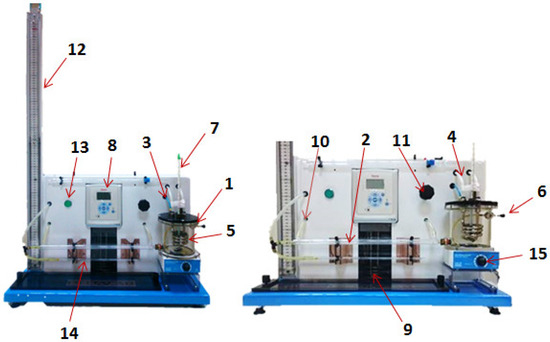 The viscosity measurement tests were performed using an EH105 capillary tube viscometer manufactured by DELTALAB (Carcassonne, France). The temperature range varied between 25 and 80 °C and the pressure was up to 2 MPa. The viscometer and some of its main parts are shown in Figure 1.