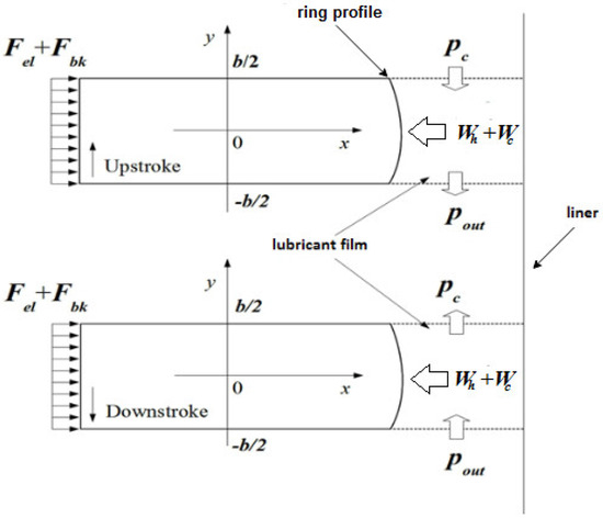 where rcr is the crank-pin radius, ω is the rotational crankshaft speed, ϕ is the crank angle, and λCR is the control ratio. The ring twist is not accounted for. The in-cylinder pressure, pc, and the outlet pressure, pout (from crankcase), values are assumed as inputs, depending on the direction of the piston motion.