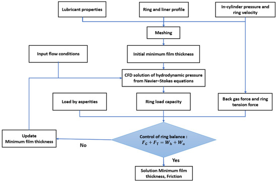 The nominal lubricant properties are obtained from the capillary tube viscometer described in Section 2.1. For clarity, the overall methodology of the ring lubrication problem is summarized and shown in Figure 4. The final solution was attained when both pressure and ring balance criteria were obtained simultaneously, and after the analysis was moved to the new crank angle location.