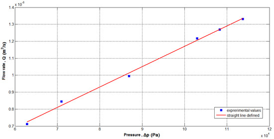 Before the viscosity procedure measurement, it was necessary to run a validation process first. The validation deals with both the whole process and equipment validity. In order to validate the viscometer and the measurement procedure, the viscosity of distilled water was first examined and measured in two different temperatures—at 25 °C in the first case and at 40 °C in the second. According to the procedure described in the flow chart of Figure 2, the flow rate of the capillary tube as a function of the applied pressure must be plotted in order to use Equation (1) for the calculation of dynamic viscosity. Therefore, two diagrams, Figure 5 and Figure 6, were obtained, one for each tested temperature. The straight line was created using the mean square least method. Furthermore, and using the data from the two previous figures, in Table 2, the experimental viscosity values are compared with the standard viscosity values of the distilled water. It is observed to be in very good agreement. Furthermore, the uncertainty concerning the viscosity measurements is also given in Table 2. The properties of the distilled water were obtained by Reference [34].