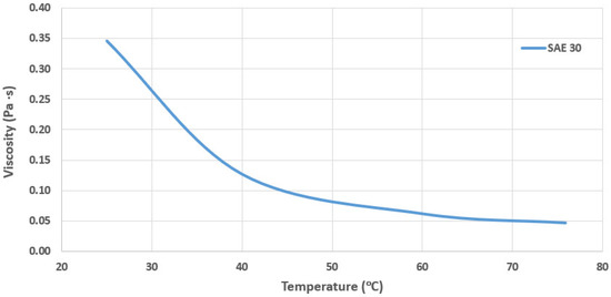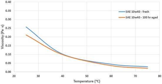 Figure 9 shows the viscosity variation of the synthetic oil SAE 10W40 after 100 engine working hours. We selected the SAE 10W40 synthetic oil, which is the base synthetic oil for the engine under investigation, reported in Reference [19]. The used engine was a four-stroke single cylinder motorbike engine. The corresponding engine speed was 1500 rpm without load. The basic specifications of the tested engine were fully provided by Zavos and Nikolakopoulos [19]. This viscosity variation due to temperature is quite significant, taking into consideration that it occurred in a period of 100 working hours. The mathematical equation, after the relevant approximation, which describes the two curves is given as [35]: