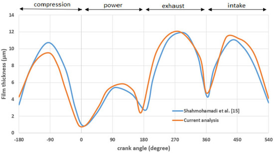 It is important to investigate the accuracy of CFD predictions. In order to validate the results from the current computational model, the computed results were compared with the predictions by Shahmohammadi et al. [15]. The same data (geometrical characteristics, velocity, and pressure profile during the engine cycle) were used for the validation. In Figure 10, the CFD predictions regarding the minimum film thickness are presented and compared. The current CFD approach neglects the effect of cavitation; however, the minimum film thickness in the ring-liner conjunction is in very good agreement with other similar analyses. More specifically, deviation is approximately 11%.
