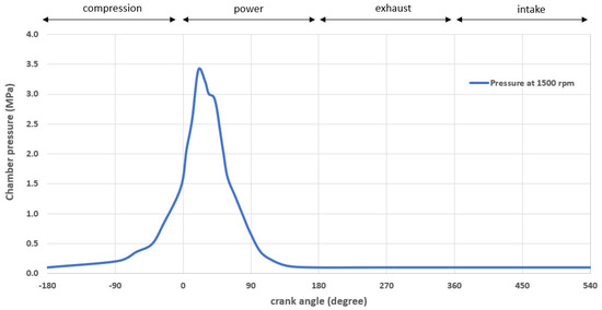 The in-cylinder pressure measurements are taken at 50% throttle and presented in Figure 11. The position of the higher chamber pressure occurs at 20 degrees crank angle, after the Top Dead Center (TDC), in the power stroke. The corresponding gas pressures were used as input in the CFD analysis to determine ring friction and minimum film thickness. Additionally, regarding oil temperature, both cold and hot engine conditions were presented and compared. These operating conditions were chosen for the simulation of the low speed NEDC (New European Drive Cycle), which correspond to both cold and hot running tests [17].
