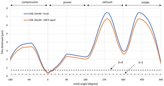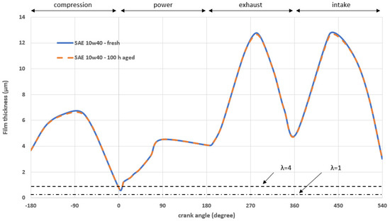where is the minimum film thickness, is the parabolic ring profile , and is the localised contact pressure-induced deflection. In reality, the ring profile has a rough axial asymmetric shape as reported in References [13,19]. However, an idealized parabolic ring shape is used in this investigation. In addition, the cylinder liner also has a perfect circular shape. The current study focuses on engine synthetic oil aging, which is suitable for the piston ring tribology undertaken here. The effect of the ring contact profile and the cylinder’s bore geometry is not the scope of this analysis. The latter parameter has a limited effect in the ring-liner contact for this analysis. According to the authors of [12], this shows that localized ring deformation has a small effect on lubricant film distribution. More specifically, this factor has a critical impact when higher combustion pressures are expected.