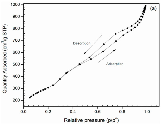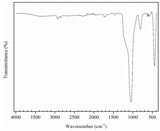 An in-depth characterization was carried out for the catalyst to identify and measure the properties that are essential for the efficient catalysis towards the formulation of estolides. The N2-adsorption of aluminosilicates at 77 K shown type (IV) isotherm (Figure 1) with a hysteresis loop supporting their large pore size and mesoporous structure. The BET-specific surface area of the catalyst was found to be 1173 m2/g with a pore volume of 1.63 cm3/g and average mesopore pore diameter of 4.7 nm. A mesoporous catalyst is favorable for large molecules like epoxidized canola biodiesel and is anticipated to increase the estolide formation via an oxirane ring opening followed by esterification. Earlier studies [11] disclosed that beyond the Si/Al ratio of 32 in the prepared catalysts indicated the decrease in total pore volume; therefore, in the present study, Si/Al ratio was maintained as 32. Presence of pentasil groups in the catalyst is indicated by the IR band (Figure 2) at 450 cm−1. Additional evidence for aluminosilicates, bands around 790, 1080 cm−1 are characteristic of SiO4 tetrahedron units. Transmission band around 1080 cm−1 is attributed to the internal asymmetric stretching vibration of Si–O–Si or Si–O–Al linkage. The absorption band by 450 cm−1 is attributed to the bending vibrations of tetrahedron-shaped orthosilicates and aluminates, which are in the form of the SiO4 and AlO4 internal tetrahedral. The presence of absorption bands around 450 and 540 cm−1 are characteristic of aluminosilicates [12,13,14].