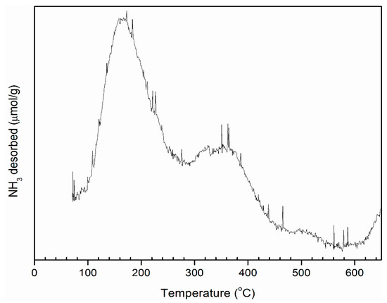 Figure 3 shows the NH3-TPD profile of aluminosilicates catalyst. From the figure, three ammonia desorption peaks were noticed between 80–600 °C, indicating the presence of surface acidic sites. The desorption peak noticed between 100 and 280 °C (low intensity) relates to physisorption/chemisorption of ammonia on the weak acidic sites. The moderate and high-intensity desorption regions between the temperatures 300–440 °C and 440–560 °C are due to moderate and strong acidic sites, respectively (Table 2). The wider desorption peak in the lower intensity area indicates that the zeolite has a higher useful group of weak surface acidic sites [11,15,16]. The XRD pattern of the catalyst is presented in Figure S1. From the Figure, it can be seen that the catalyst produced amorphous peaks (2θ at 12.5° and 28.9°), which correspond to the aluminosilicates (JCPDS No. 42-0023) [17]. Also, the characteristic peaks of the catalyst configuration designate higher crystalline structures and purity which are characterized to be zeolites. Low intensity of the peak with 2θ at 12.5° attributed to the less crystallinity of the zeolites with high aluminum content. The relative crystallinity was calculated using the Scherer equation and it was found to be 26–29 nm.