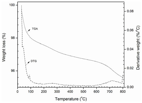 Figure 4 shows the differential thermal analysis and thermogravimetric (DTG/TGA) of the catalyst. Only 4% weight loss was observed and it was attributed to the desorption of water, which was strongly combined in the aluminosilicates and the disintegration of a carbon-based composite such as TPAOH and the transformation of hydroxide mixtures to oxide form [17].