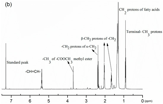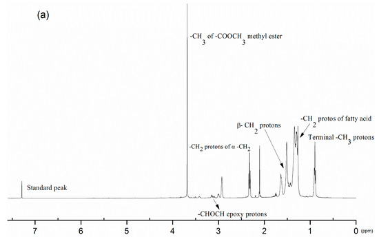 1H NMR spectra were collected on a Bruker Avance 500 MHz spectrometer (Bruker, Billerica, MA, USA) with a 5 mm Broadband Inverse (BBI) probe for product confirmation and formation of the estolides. The 1H NMR spectra were referenced to δ 7.26 ppm in a CDCl3 solvent for all the experiments. The 1H NMR technique was used to measure the percentage of epoxy groups converted into estolides based on the conventional integration method at the respective chemical shifts.