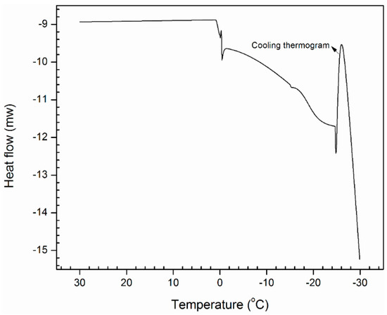 From the previous studies on estolide formulation, they were known for interesting chemical behavior, superior biodegradability, and better lubricity properties compared to conventional lubricants [21]. Hence, evaluating the physicochemical properties of the formulated estolides aids in finding the suitable area of applications as biolubricant basestocks. Cold flow properties of the epoxidized canola biodiesel and formulated estolides are found to be 0 °C [22] and −28 ± 2.3 °C (Figure 6) respectively. The low-temperature properties of estolides are enhanced significantly (−28 °C) compared to epoxidized canola biodiesel (0 °C) due to the addition of oleic acid during oxirane ring opening followed by esterification. Upon functionalization of the oleic acid to epoxidized canola biodiesel, branching of the fatty acid structure was increased as shown in Scheme 1. In addition to the branching, the presence of the unsaturation in oleic acid promoted the resistance to the self-stacking of fatty acids present in the estolides at low temperatures and led to higher estolides mobility, up to −28 ± 2.3 °C [23]. The pour points of the estolides are found to be promising and besides, they meet the standard lubricant specifications of ISO VG32, VG46, VG68, VG100 (−6 °C), SAE20W40 (−21 °C), and AG100 (−18 °C) [24]. During the study, it was determined that oleic acid branching at the center of the fatty acids (present in the epoxidized canola biodiesel) chain makes a stearic barrier around the different fatty acid molecules thereby crystallization was subdued, which results in the lower pour point of estolides. Similar explanations were also reported by other research investigations and lower pour-point estolides are suitable for engine oil and hydraulic oils [10,25].