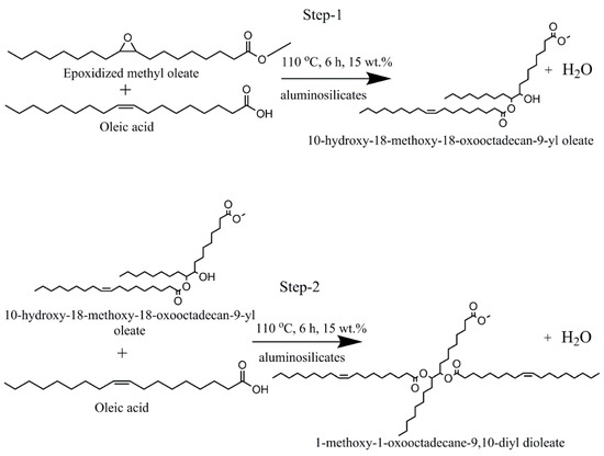 To date, different kinds of estolides and their esters have been developed and tested. A comprehensive review of the investigations on the formulation of various kinds of estolides and their property evaluation by Cermak and Isabell [4,5] is given in Supplementary Materials (Section S1). Most of their work focused on estolides formulation from ricinoleic acid with different saturated fatty acids, mono-unsaturated fatty acids and small, long chain alcohols using perchloric acid as a catalyst. However, there are few reports available on estolides formation via epoxidation route. Kiatsimkul et al. [6] reported on the preparation of ricinoleic acid estolides using lipase as a catalyst at 170 °C for 120 h of reaction time with oleic acid (0.66 mol) to produce high equivalent weight vegetable oil-based polyol from epoxidized soybean oil. Ashby et al. [7] derived unsaturated estolide ester from the sophorolipids made from the bioconversion of a mixture of glucose (GLC) to linoleic acid (LA) and an epoxy estolide ester to oleic acid (OA) substrates to use them as additives in solution-cast poly (3-hydroxybutyrate) (P3HB) films.