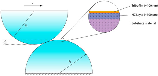 Sliding friction under boundary lubrication has been studied for almost a century [1,2,3,4,5]. In the boundary lubrication regime, the lubricant film is not sufficiently thick to separate the surfaces and solid-to-solid contact will occur. Under these conditions, primarily, the highest peaks (asperities) on the surfaces will come into contact. Therefore, the asperities are carrying the load locally, so on a microscale, the stresses exceed the yield of the material causing plastic flow even though the macroscopic pressure is well below the yield limit. This elastoplastic deformation of asperities has been regarded as one of the important sources of friction [2]. Meanwhile, a solid layer is also generated in boundary lubrication and plays a crucial role in protecting the system against severe friction and wear. This layer consists of two separate layers, one produced by chemical reactions and one by the mechanical energy dissipated at the top layer of the bulk material (nanocrystalline (NC) layer) (see Figure 1). The properties and composition of these layers are dominated by the lubricants used (mainly the additives package) and the conditions under which the system is running. Using this representation of the system in previous publications, wear rates were successfully predicted [6,7]. In these publications, mechanical properties available in the literature were used for both the NC layer and the tribofilm. However, the coefficient of friction was presumed known and constant. In this publication, the latter will be investigated in more detail and the main question to be answered is: “Can plastic deformation of the tribofilm and NC layer explain the coefficient of friction observed in boundary lubrication?”