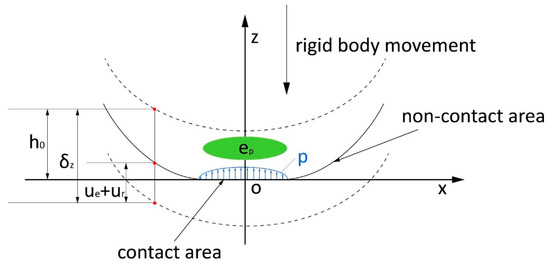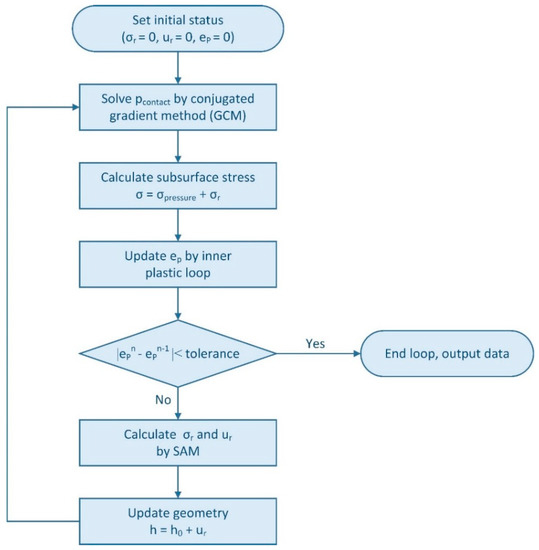 With ue(p) and ur(ep) being expressed, the pressure distribution p and plastic strains ep are now explicitly linked to the inputs (rigid body movement δz and initial surface geometry h0) by Equations (1)–(4). This is in essence an M*N linear system. However, it should be noted that the subsurface stress generated by the surface contact pressure causes plastic strains. These plastic strains cause residual displacement and stresses, which in turn alter the geometry and change the surface contact pressure. In other words, p and ep are coupled. Thus, a direct solution is difficult to acquire.