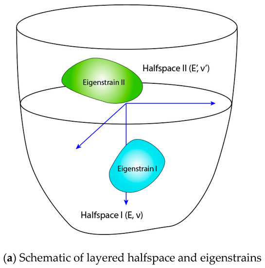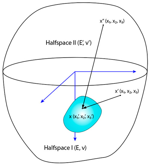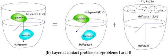 Firstly, a simple case is introduced, see Figure 3 [30]. A full space is composed of two halfspaces I and II. These two halfspaces are perfectly bonded, while eigenstrains exist in halfspace I.