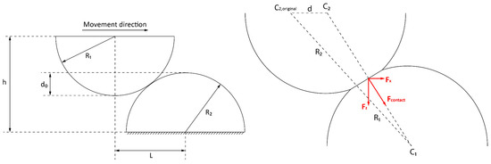 In this work, the sliding asperity contact was idealized as a normal contact between two semispheres, following the work of Boucly [31] (see Figure 7). Using a semisphere to represent the asperity is a commonly adopted approach when studying a single asperity contact, as it allows a relatively simple calculation of the contact parameters. The two semispheres are aligned with the distance between two basis planes being held constant as h, while the interference depth is d0. Elastoplastic behavior of both tribofilm and substrate materials are considered, while adhesion between the surfaces is ignored.
