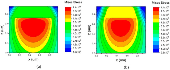 Contour of von Mises stress: (a) σtribofilm = 500 MPa; (b) σtribofilm = 800 MPa.