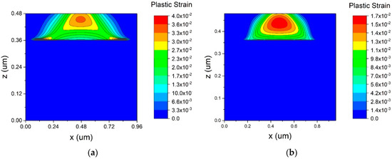 Contour of equivalent plastic strain: (a) σtribofilm = 500 MPa; (b) σtribofilm = 800 MPa.