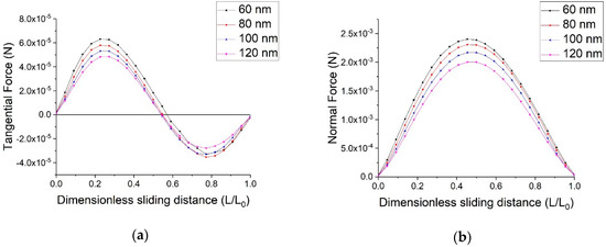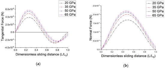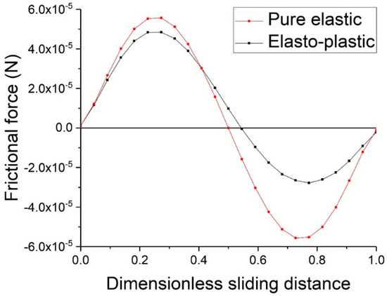 Without considering adhesion effects, the sole mechanism behind friction in single asperity sliding is plastic deformation. The tangential force during the simulated sliding process is shown in Figure 11 for both an elastic and an elastoplastic contact.