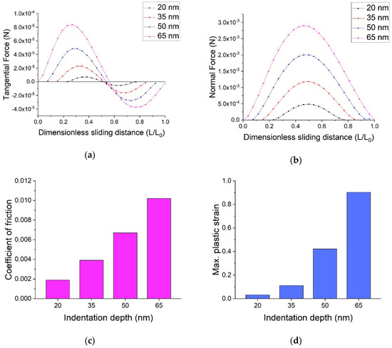 A series of interference depths were applied (20, 35, 50, and 65 nm), while other parameters were held constant (see Table 1). The results are shown in Figure 12, where it becomes clear that the tangential force increases with interference fit, which makes sense as more material is plastically deformed. This is also reflected by the increase in calculated coefficient of friction. It should be noted that the maximum plastic strain in the SAM calculations should not exceed 10% to ensure stable results [37]. The increase in plastic deformation of the tribofilm also indicates that an increase in wear could be expected for the system under consideration, suggesting a relation between friction and wear.