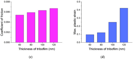 Results for different tribofilm thickness: (a) frictional force; (b) normal force; (c) coefficient of friction; (d) max. equivalent plastic strain.