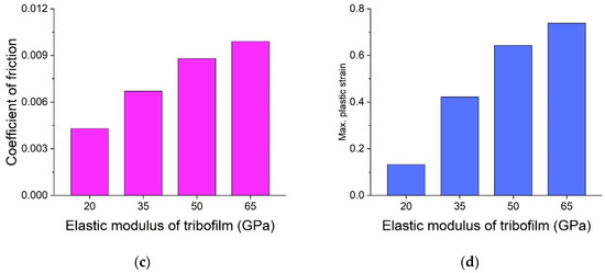 Results for different tribofilm elastic modulus: (a) frictional force; (b) normal force; (c) coefficient of friction; (d) max. equivalent plastic strain.