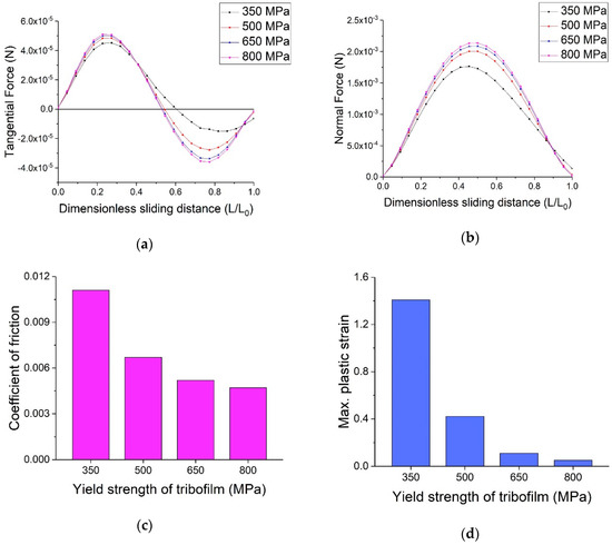Results for different tribofilm yield strengths (a) frictional force; (b) normal force; (c) coefficient of friction; (d) max. equivalent plastic strain.
