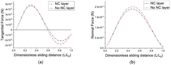 With the presence of an NC layer, the frictional and normal contact forces increase. The reason for this effect is similar with a higher yield strength of the tribofilm leading to a higher normal contact force: the less strong NC layer allows higher plastic strain and displacement. Therefore, the geometry can better accommodate the contact deformation.
